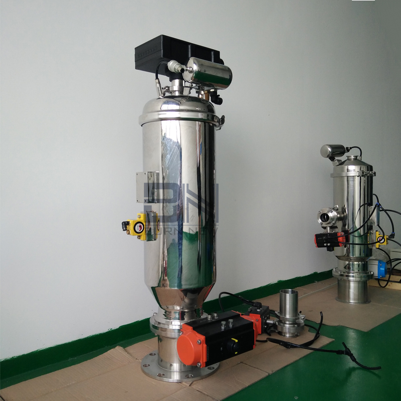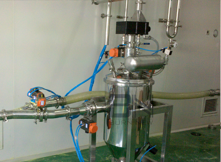 在A、B兩種情況下,輸送過程必須采用氮氣保護。輸送過程中因為摩擦易產生靜電引起危險,A狀況一般很難碰到。因為絕大多數物質的起爆能MIE>3mJ。對于C狀況,物料在分離倉時需要經過特殊處理,物料到達分離倉將要卸料前,吸料口通過一個閥門可自動關閉。然后反吹氣囊吹入惰性氣體保證安全,并使其壓力達到平衡。然后物料即可進入所有輸送場所。
